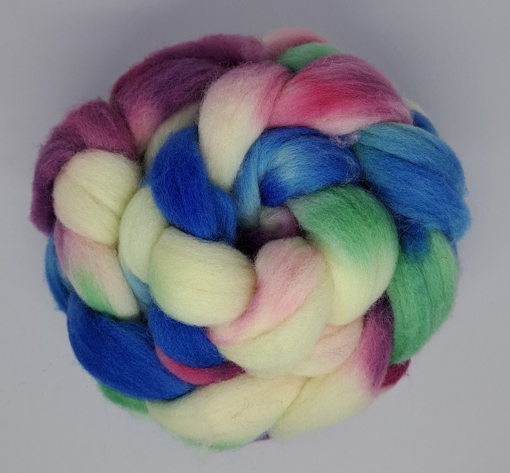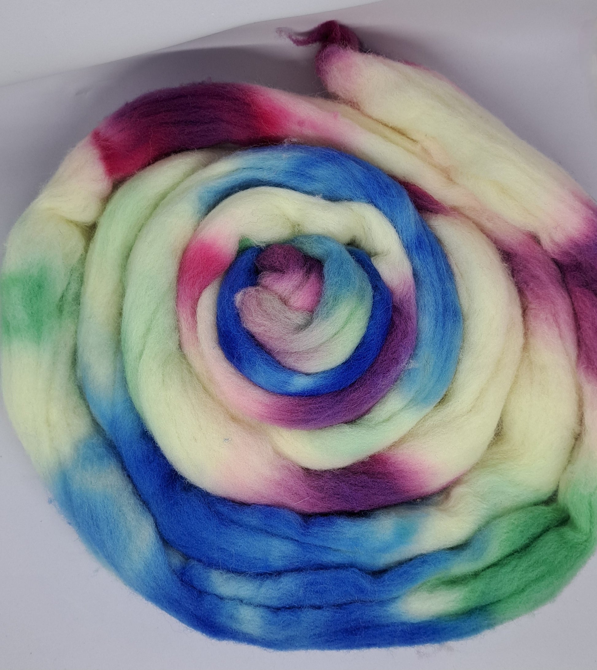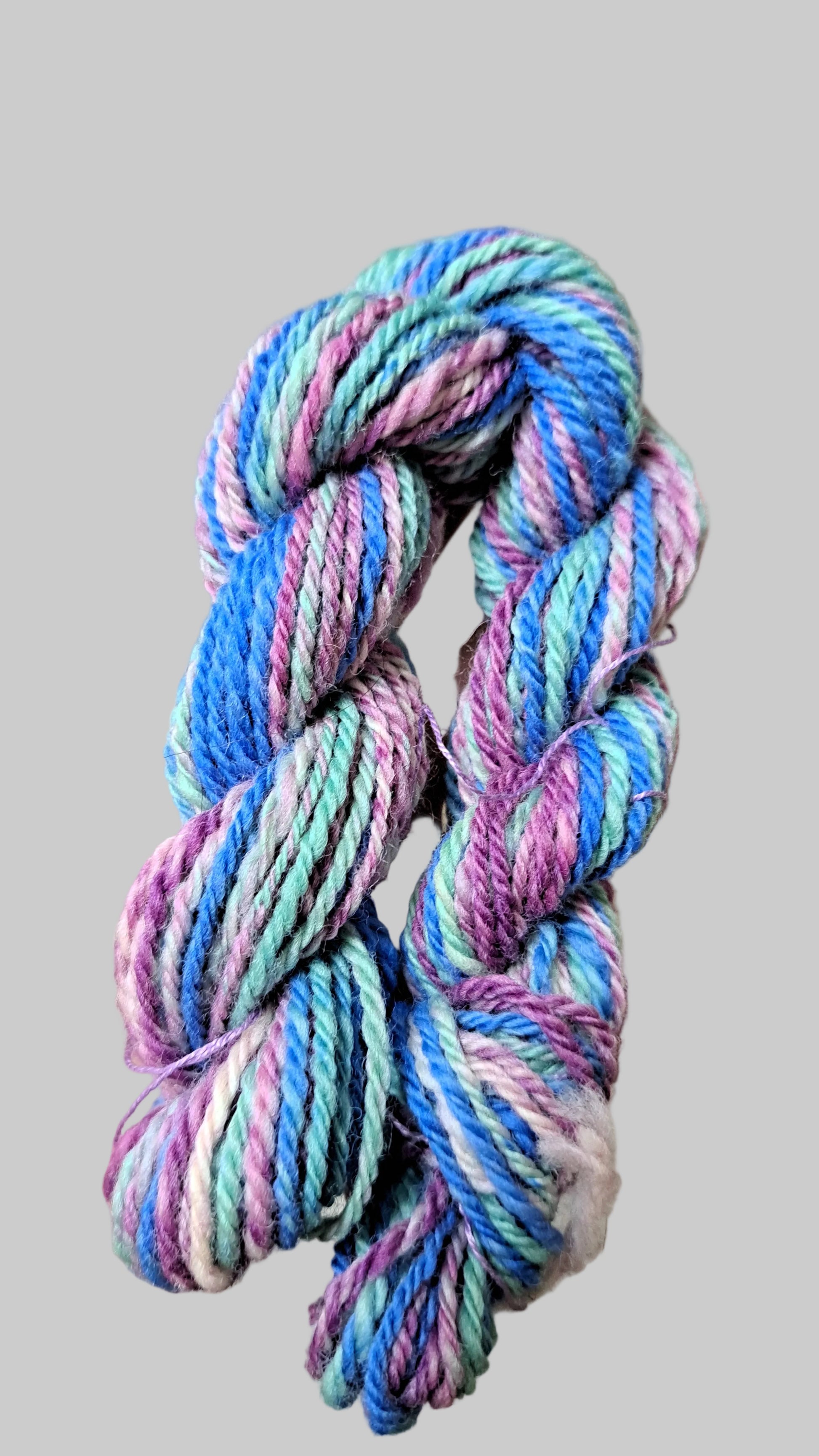 This colorway is hand-dyed on 4 ounces of wool sourced from Eastern US sheep. The fiber is medium in fineness, with a soft hand, excellent bounce, and a crisp, satisfying draft, making it a joy to spin. Perfect for spinners who love dramatic winter palettes with depth, movement, and a touch of magic.